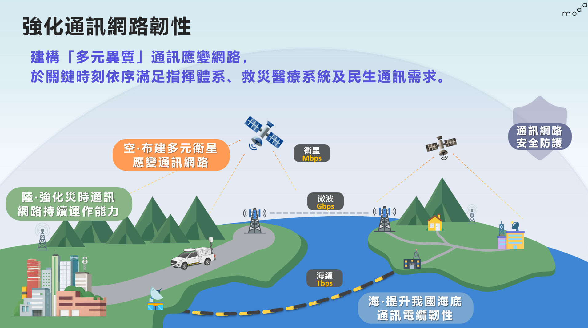 從海、陸、空多面向建構多元通訊應變網路,提升整體通訊網路營運韌性,於關鍵時刻依序滿足指揮體系、救災醫療系統及民生通訊需求。